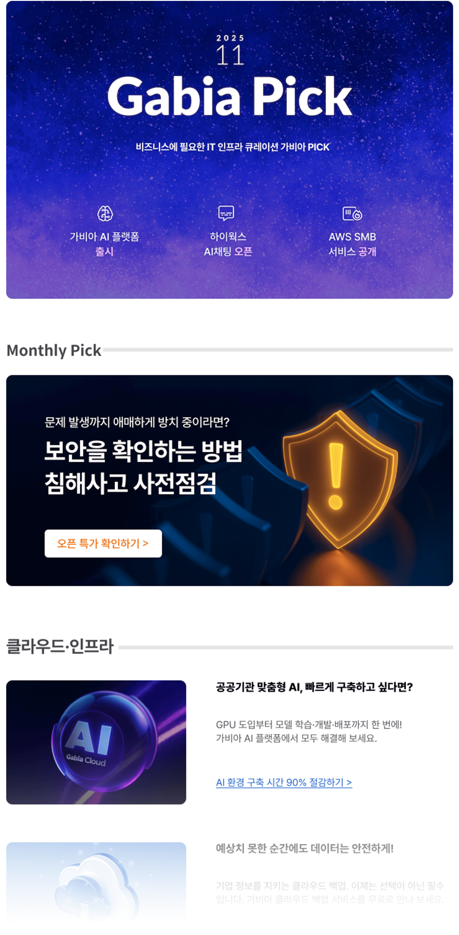비즈니스에 필요한 IT 서비스를 추천하는 월간 뉴스레터 <가비아 PICK>이 시작되었습니다.